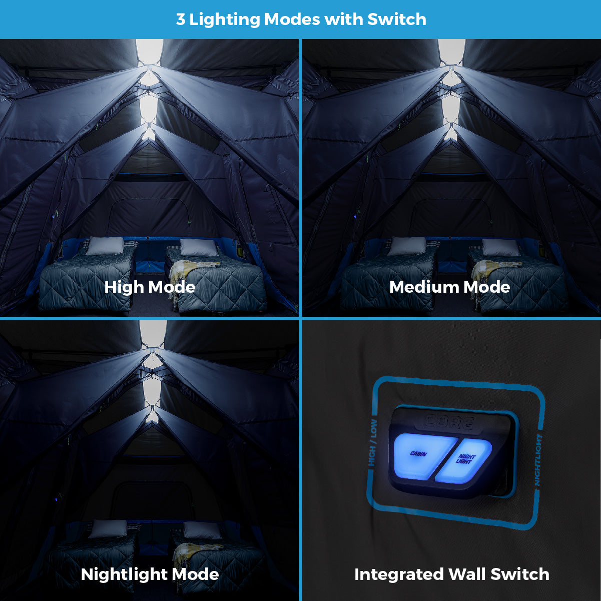 - BUILT-IN LED LIGHTING: A wall switch controls LED lights built into the ceiling poles with 3 levels of glare-free, evenly spread lighting: high, low, and night light.