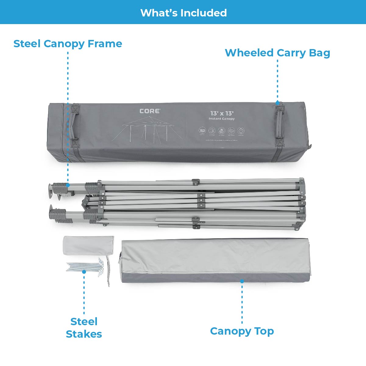 - WHAT’S IN THE BAG: Includes frame, canopy with attached guylines, stakes, and wheeled carry bag.