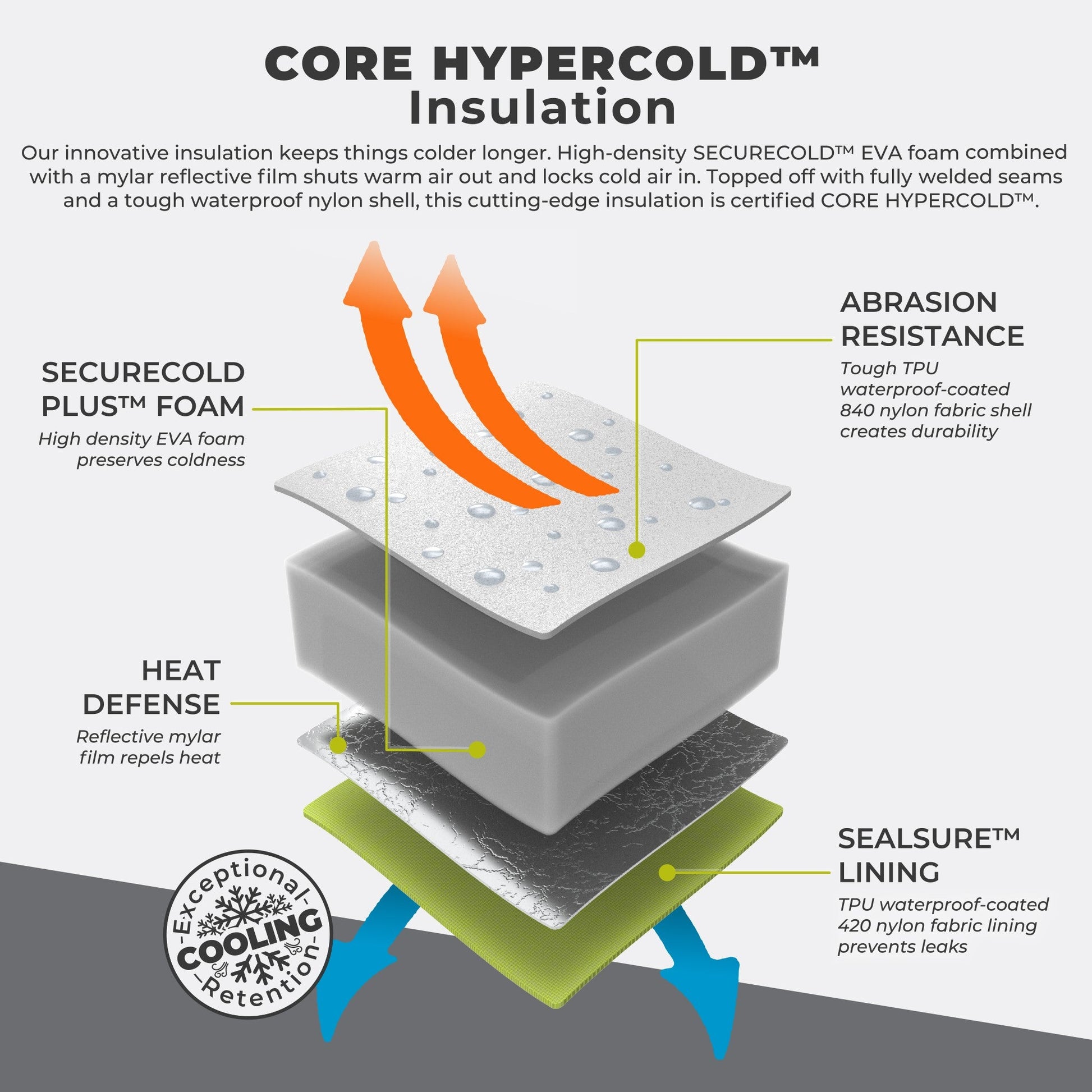 - SUPERIOR ICE RETENTION: CORE HYPERCOLD™ Insulation keeps contents chilled up to 3.5 days, using high-density EVA foam to retain cold, combined with reflective mylar film to repel heat.