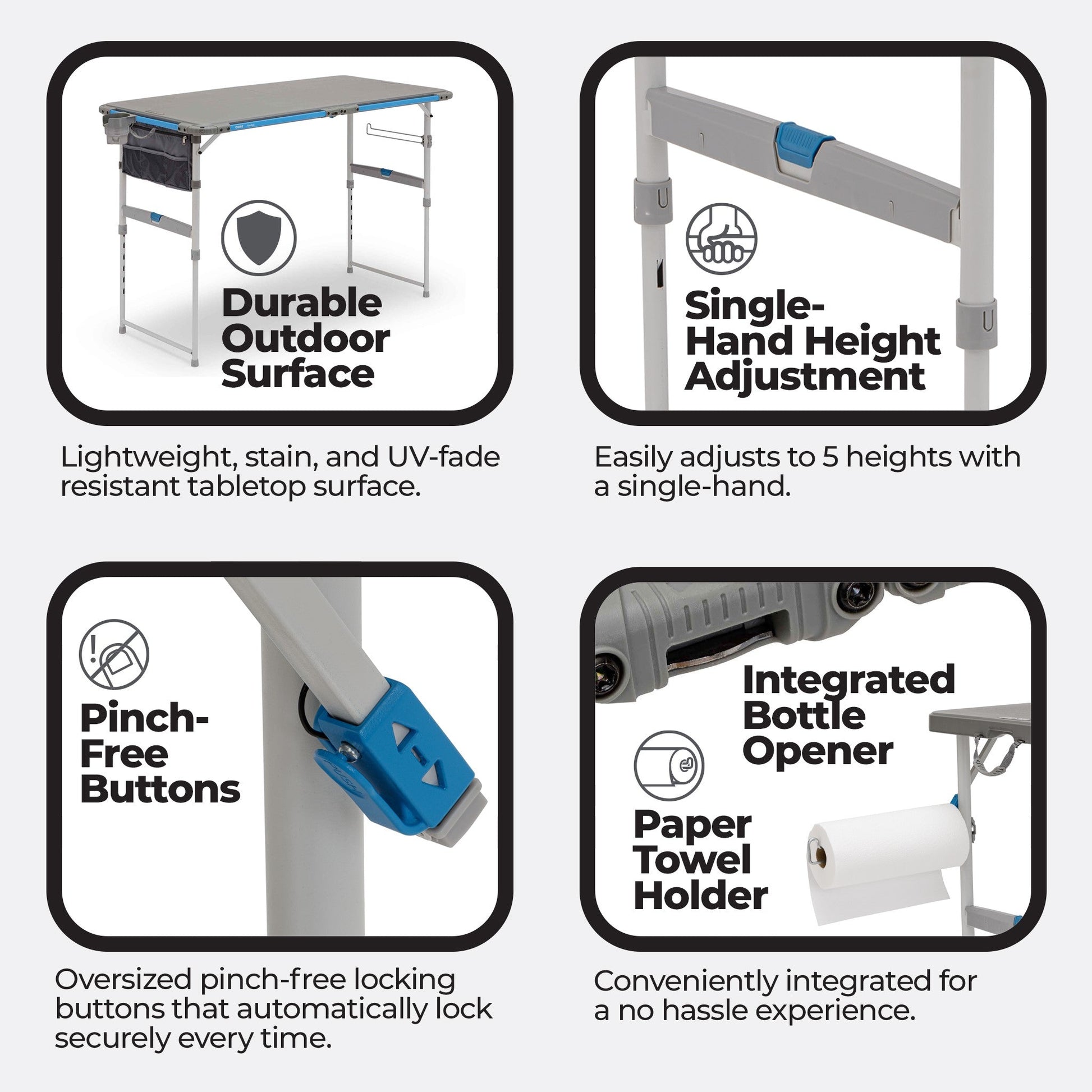 - PAPER TOWEL HOLDER / BOTTLE OPENER: Swiveling paper towel holder located on leg and bottle opener integrated into FlexRail™.