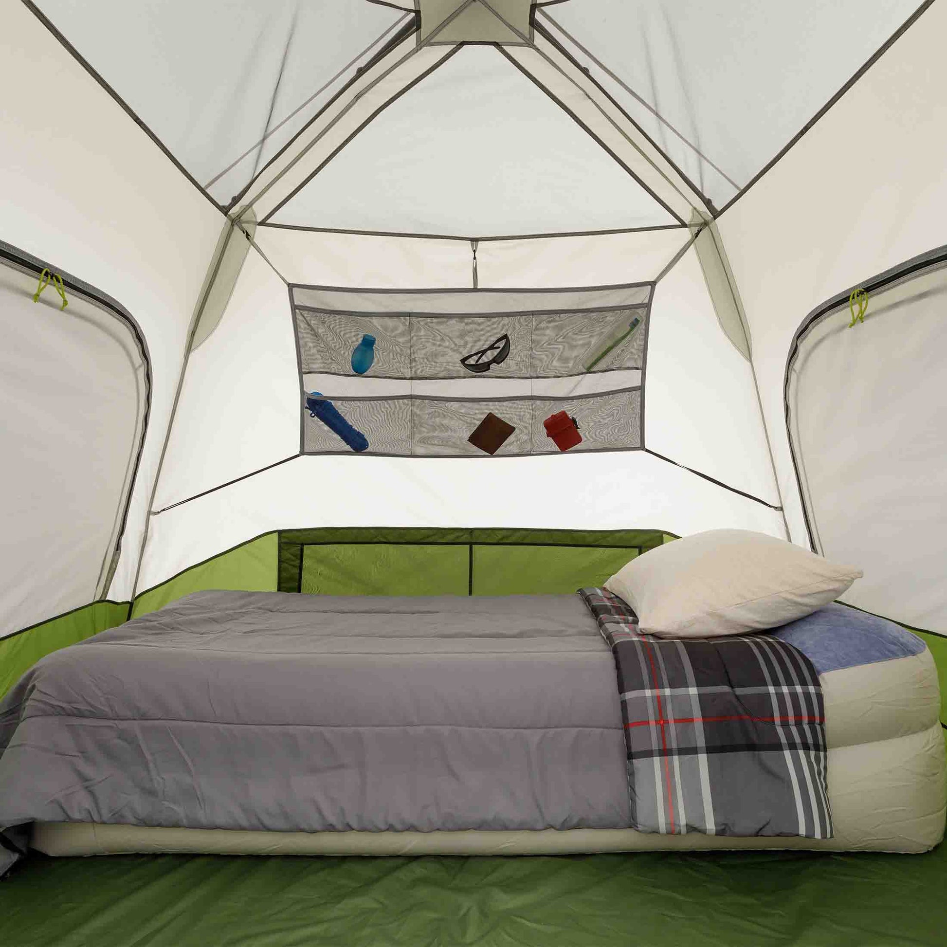 - WHAT’S IN THE BAG: Includes tent with pre-attached poles, rainfly with attached guylines, wall organizer, tent stakes, and carry bag.