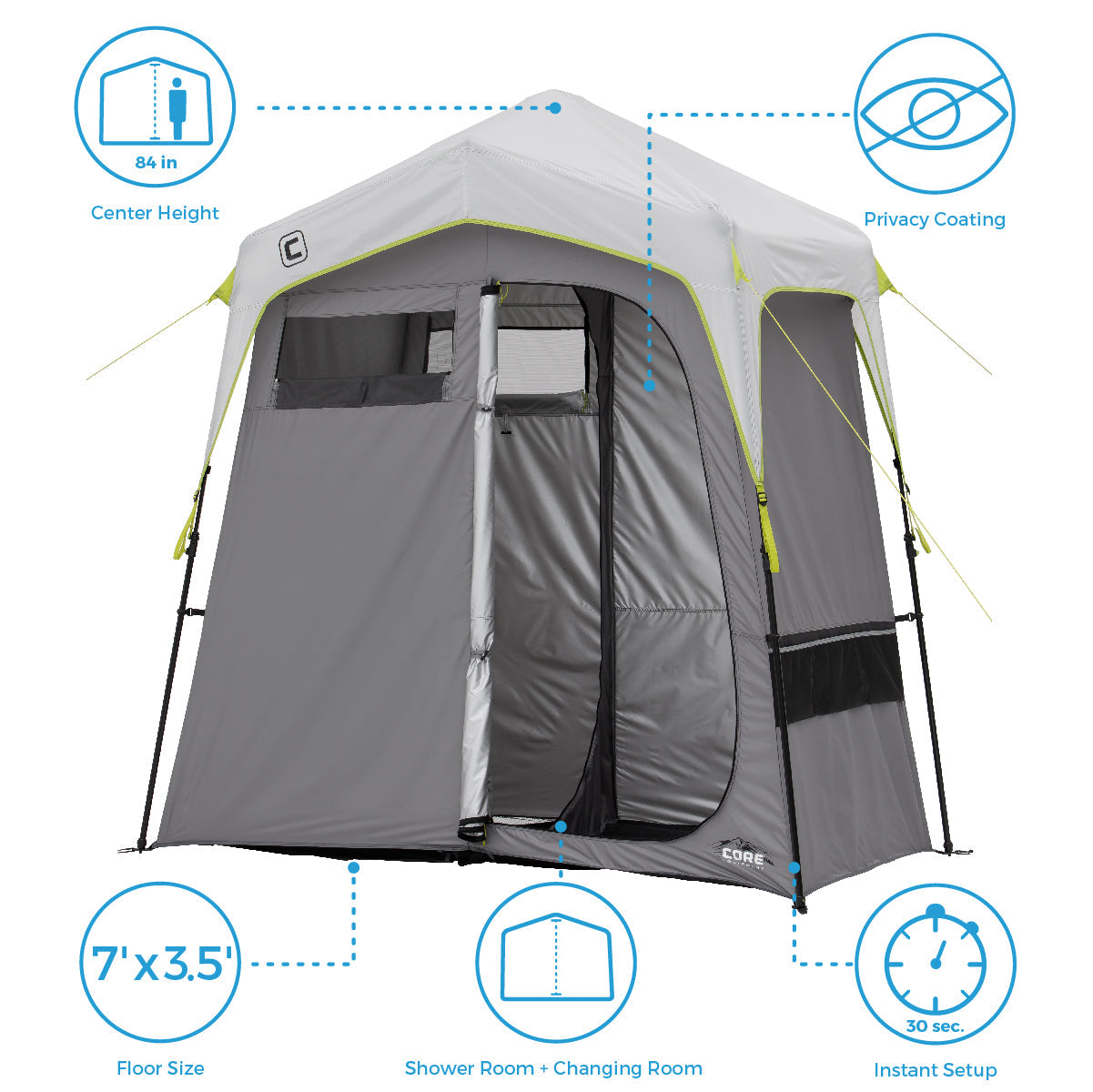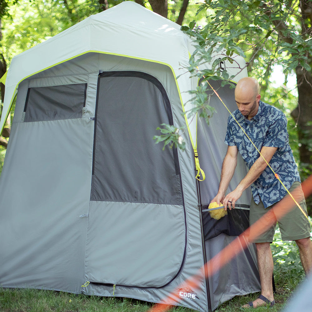 - SEPARATE ROOMS: A zippered door panel creates 2 rooms: a shower room and a changing room