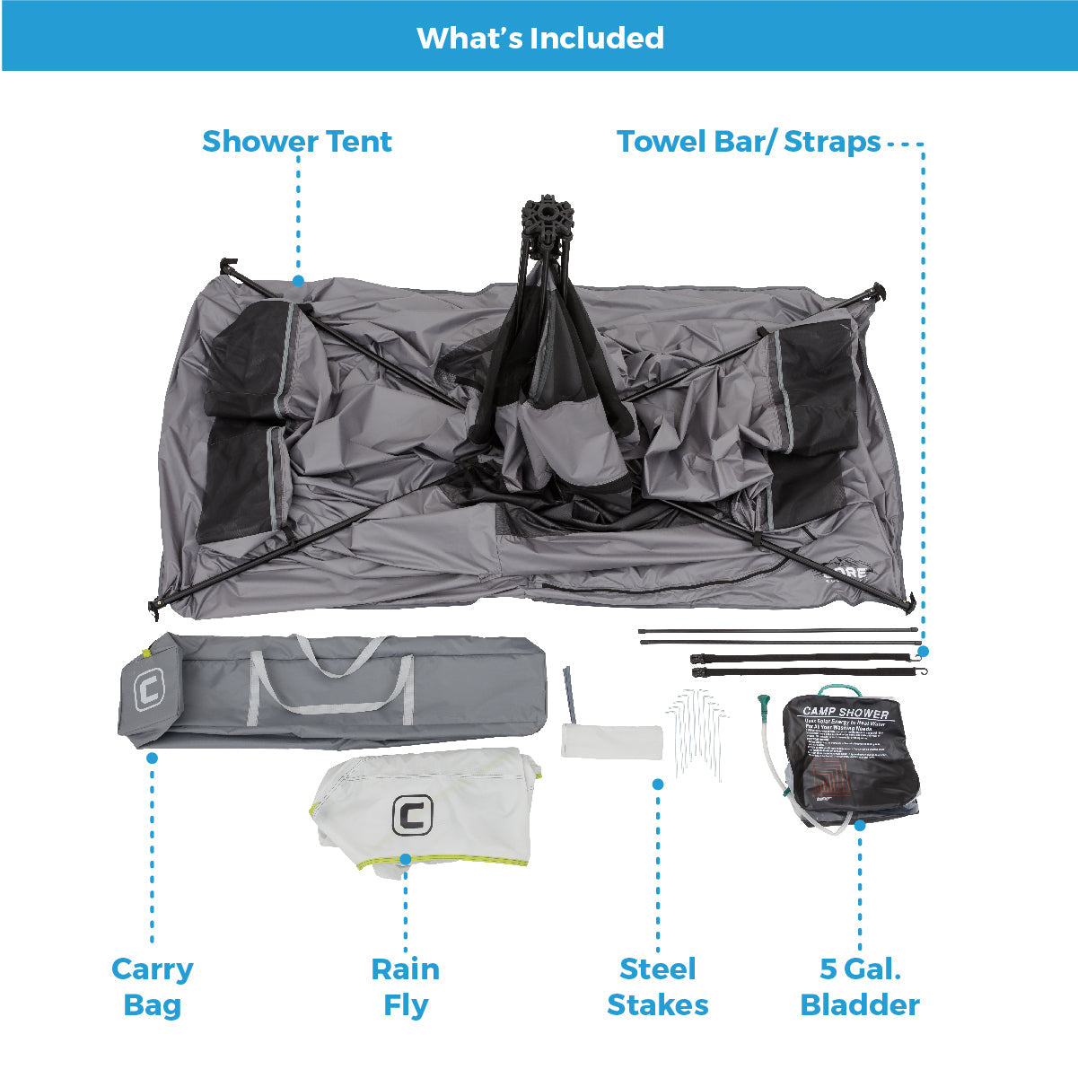 - WHAT’S IN THE BAG: Includes shower tent with pre-attached poles, rainfly with attached guylines, 5-gallon water bladder, towel bars and straps, stakes, and carry bag