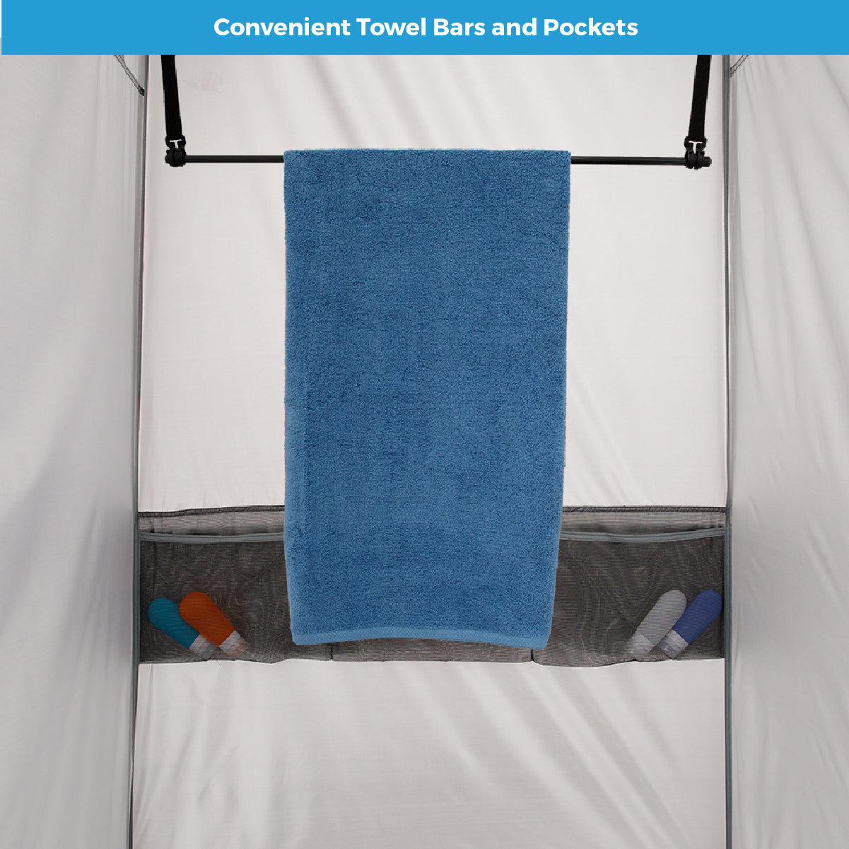 - ORGANIZATION AND STORAGE: 2 included towel bars hold wet or dry items, and integrated storage pockets keep personal belongings close at hand