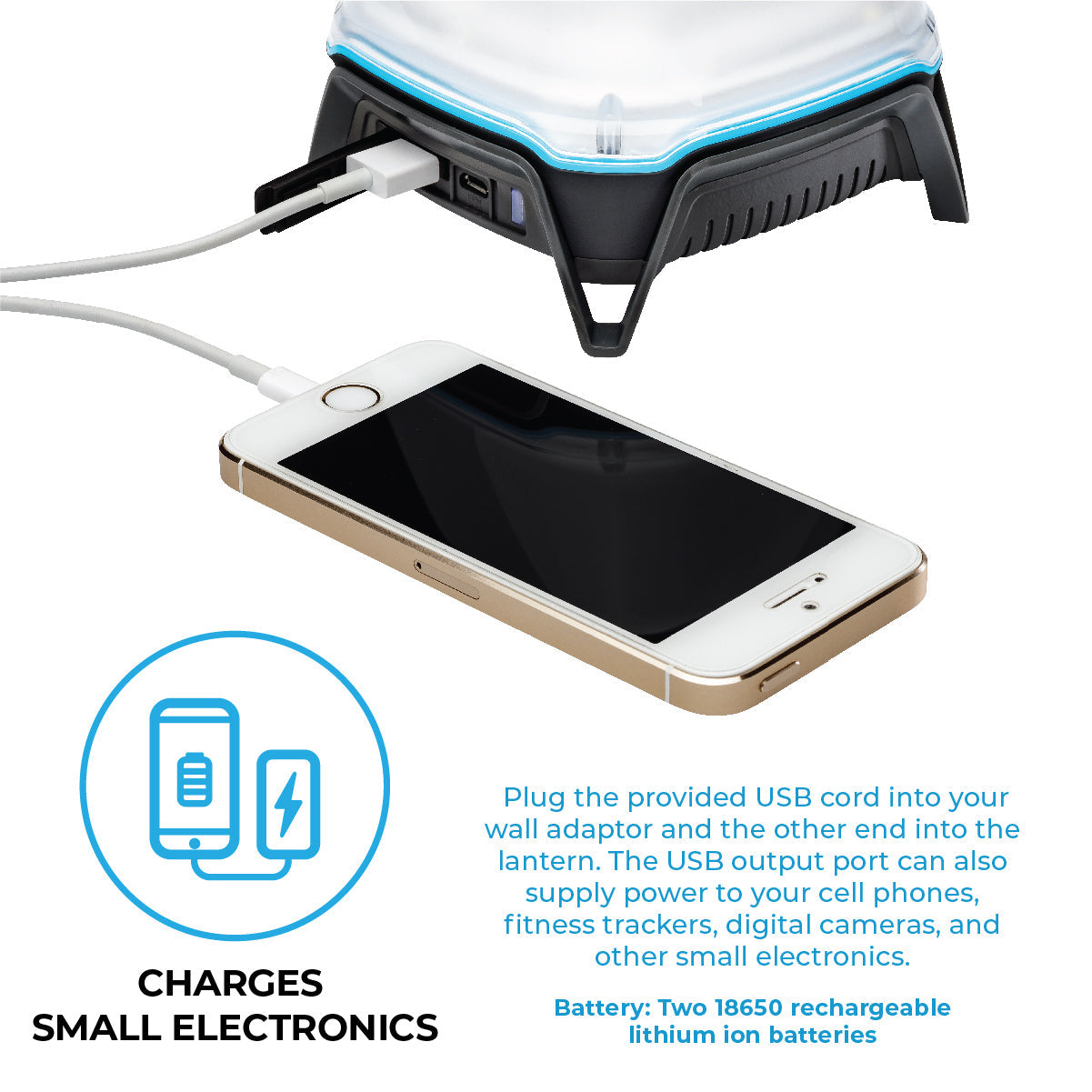 - CHARGES SMALL ELECTRONICS: Plug the provided USB into your wall adaptor and the other end into the lantern. A solid green light will indicate a full charge. It can, also, be used as a power bank. The USB output port can supply power to your cell phones, fitness trackers, digital cameras, and other small electronics.