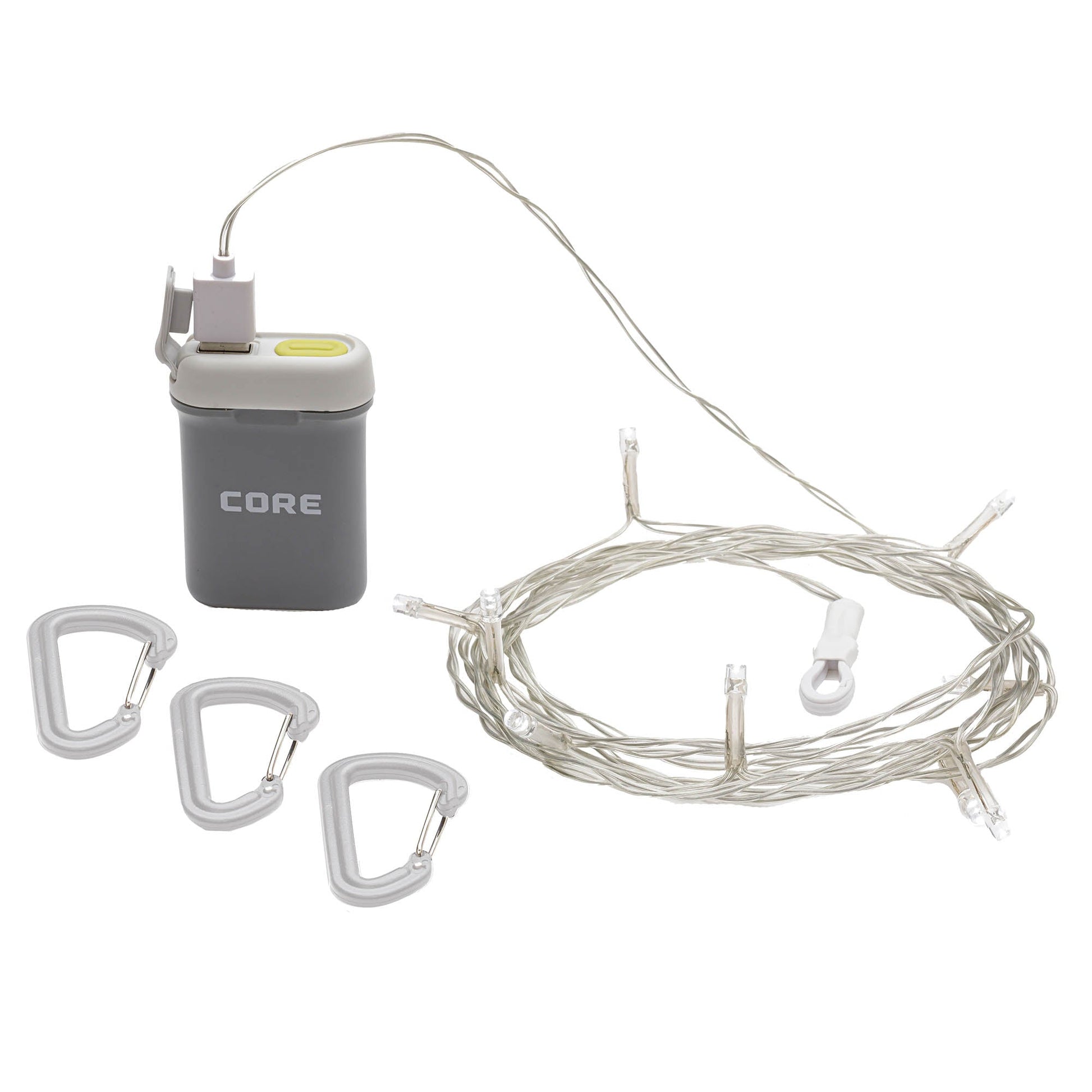 Fun, flexible lighting for your campsite or backyard. Hang these bright string lights using the included carabiners and enjoy hours of light into the night. The CORE String Lights have 13 bright lights that feature a high and low mode. Stringing 20 feet long, the 100 lumens will brighten up your campsite!